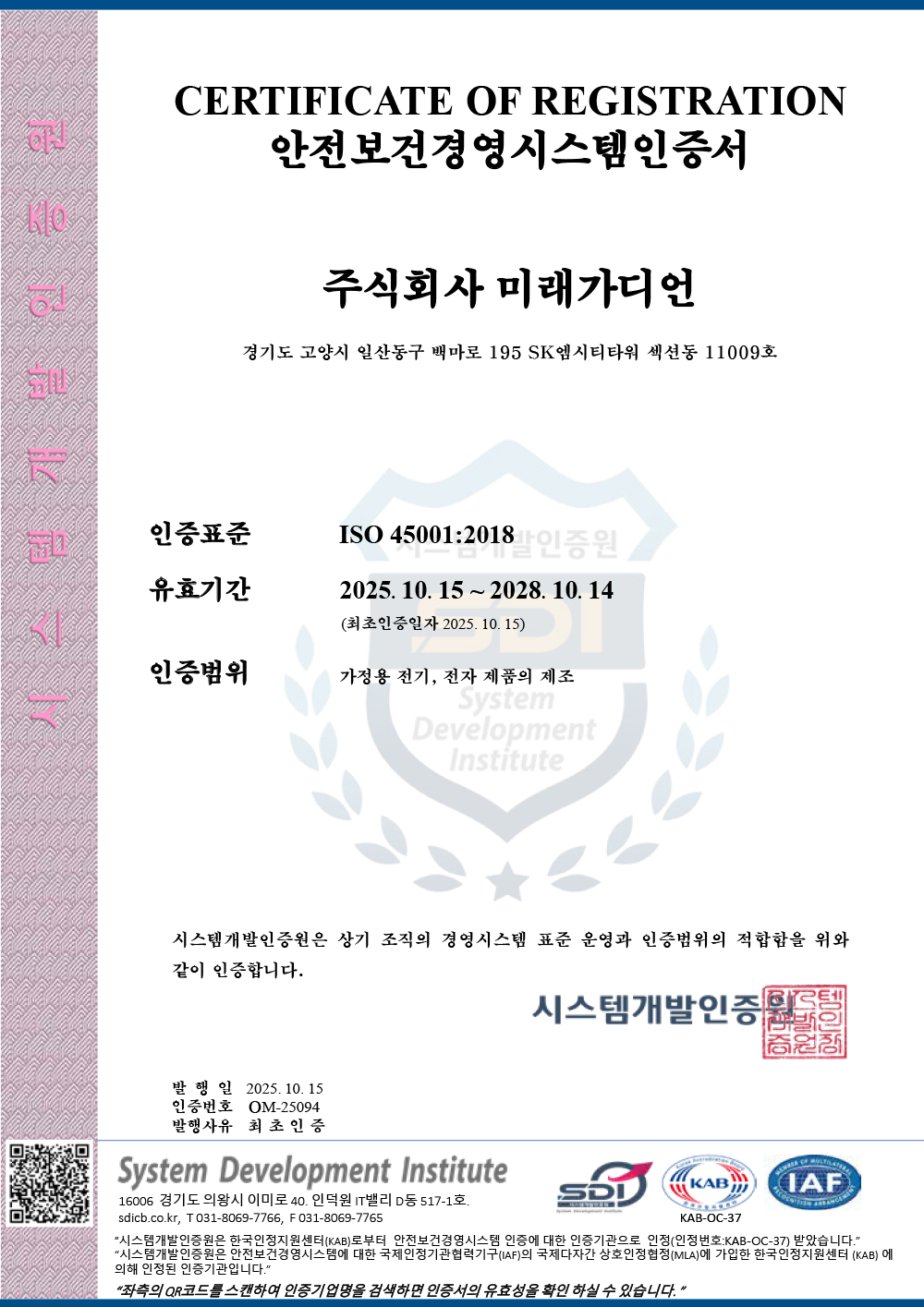 안전보건경영 시스템 인증서 등록