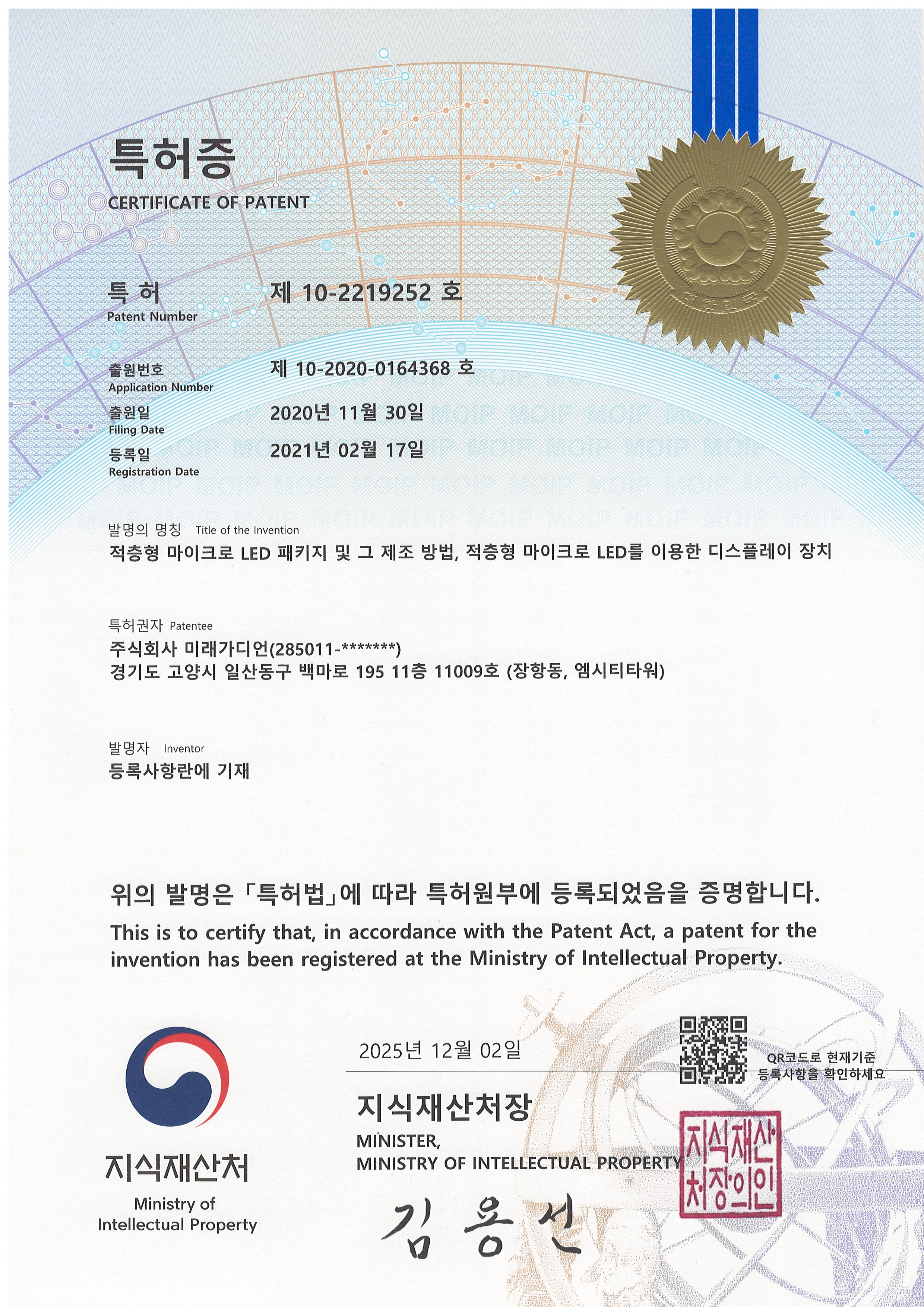 마이크로 LED 디스플레이 특허증